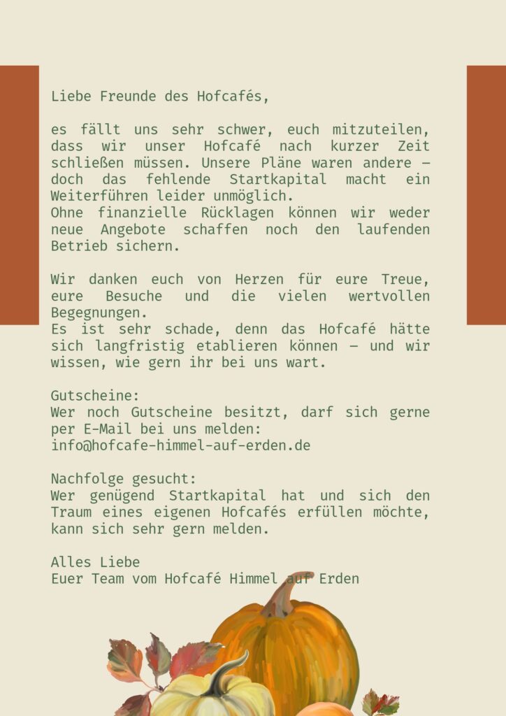 es fällt uns sehr schwer, euch mitzuteilen, dass wir unser Hofcafé nach kurzer Zeit schließen müssen. Unsere Pläne waren andere – doch das fehlende Startkapital macht ein Weiterführen leider unmöglich.
